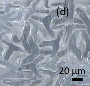 Le rôle de l’ENSAIT, via le laboratoire GEMTEX est de développer des supports de croissance cellulaire via la réalisation de structures tricotées à base de multifilaments. Un multifilament est un fil composé de plusieurs filaments continus : le choix d’une telle structure permet de créer plus de porosité et de surface d’attachement pour les cellules, à l’échelle du fil, mais également une multiporosité (entre les filaments, entre les boucles de mailles du tricot. A travers ces multifilaments, deux études sont menées : une première sur la quantité de lignine dans une matrice PBS sous forme de fils (figure (a)), dans les mêmes pourcentages que pour l’électrofilage réalisé par CENTEXBEL, et l’effet antibactérien qu’elle y apporte. Une deuxième étude porte sur la forme de section des filaments en PLA (section circulaire (b) ou en étoile à trois (c) ou huit branches (d)). L’impact des paramètres de mise en oeuvre, tels que la température et l’étirage, sont également étudiés.